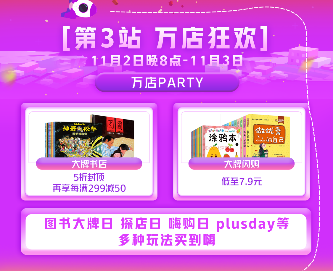 在萬店狂歡活動中,圖書大牌日、探店日、嗨購日、PLUSDAY等多種玩法更是能夠讓各位讀者朋友一次買到嗨。眾多大牌書店紛紛推出5折封頂再享每滿299減50的鉅惠福利,低至7.9元的大牌閃購和大牌神券更是讓無數讀者動心。