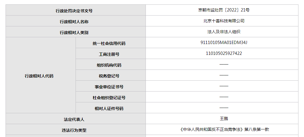 本網此前報道,今年1月,北京十薈科技有限公司(以下簡稱當事人)還曾因違反《中華人民共和國反不正當競爭法》被市場監管部門罰款30萬元。
