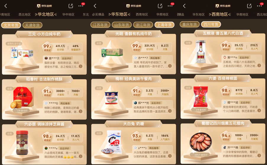 除了區域特色年貨金榜,此次京東年貨節還推出了地方特色年禮、老字號好店集市、地道鄉味熱點京選集、千縣名品“武林外傳”熱點特刊等更多精彩內容,讓消費者能夠盡情探尋家鄉寶藏特產,感受豐富多元的“逛購”體驗。