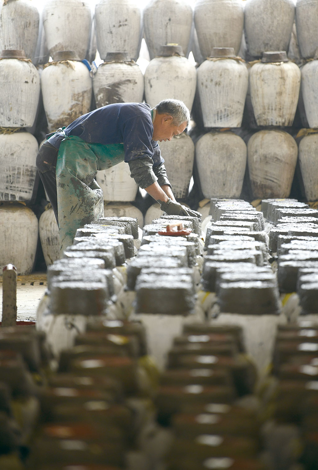 在浙江塔牌紹興酒有限公司,釀酒師傅給春榨結束的黃酒糊泥頭封壇。