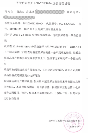 夏普商貿(中國)有限公司向本網提供的一份高先生所在維修網店情況說明中描述稱:“網點師傅上門檢查,遠看液晶屏左側像一條不到底的豎線,近看發現液晶屏左側有多條豎線非貫穿上下,豎線下方末端處有一個撞擊亮點。”“亮點呈四周發散狀,由此處可判斷液晶屏裂痕是因受到外力所導致。”