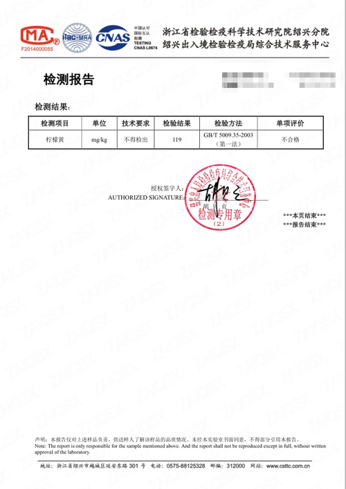 張先生原本買茶葉是想送朋友,但飲用茶葉時(shí),發(fā)現(xiàn)有大量黃色沉淀物。他將所購(gòu)茶葉送至浙江省檢驗(yàn)檢疫科學(xué)研究院紹興分院---紹興出入境檢驗(yàn)檢疫局檢驗(yàn)檢疫綜合技術(shù)中心(以下簡(jiǎn)稱“紹興檢驗(yàn)檢疫中心”)進(jìn)行檢驗(yàn)。紹興檢疫檢疫中心出具的檢測(cè)報(bào)告顯示,三只松鼠公司所售茶葉中含有大量檸檬黃(一種合成色素),檢測(cè)結(jié)果為不合格。