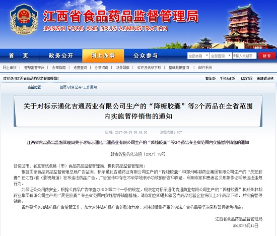中國質量新聞網(wǎng)訊 據(jù)江西省食品藥品監(jiān)督管理局官網(wǎng)8月15日消息,該局發(fā)布通知,對標示通化吉通藥業(yè)有限公司生產(chǎn)的“降糖膠囊”和鄭州韓都藥業(yè)集團有限公司生產(chǎn)的“靈芝膠囊”在全省范圍內(nèi)實施暫停銷售措施,要求轄區(qū)內(nèi)藥品經(jīng)營企業(yè)將以上2個藥品下架,并實施暫停銷售。