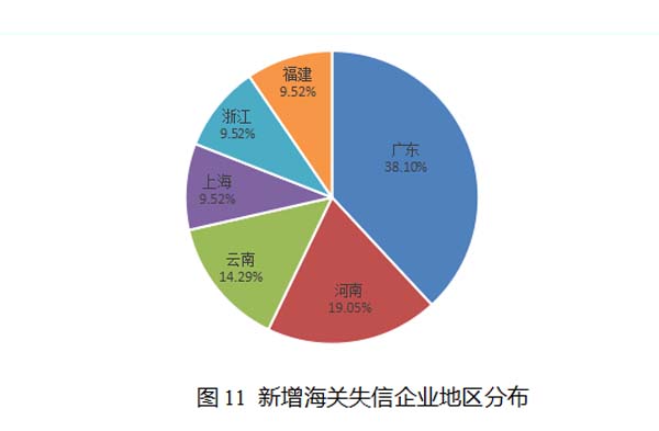 海關失信企業:本月新增海關失信企業21家,分布在廣東、河南、云南、上海、浙江、福建六省份,其中廣東省數量最多,共8家,占比38.10%(見圖11)。