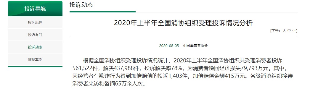 根據(jù)全國(guó)消協(xié)組織受理投訴情況統(tǒng)計(jì),2020年上半年全國(guó)消協(xié)組織共受理消費(fèi)者投訴561,522件,解決437,988件,投訴解決率78%,為消費(fèi)者挽回經(jīng)濟(jì)損失79,793萬(wàn)元。其中,因經(jīng)營(yíng)者有欺詐行為得到加倍賠償?shù)耐对V1,403件,加倍賠償金額415萬(wàn)元。各級(jí)消協(xié)組織接待消費(fèi)者來(lái)訪和咨詢65萬(wàn)余人次。