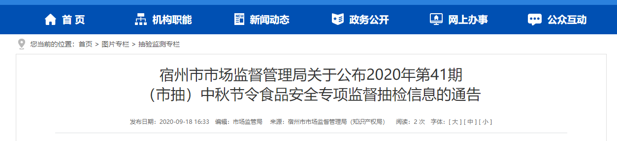 中國質量新聞網訊 (記者 徐遠官) 9月18日,安徽宿州市市場監督管理局官網公布2020年第41期(市抽)中秋節令食品安全專項監督抽檢信息。近期,宿州市市場監督管理局組織了市級1類食品監督抽檢。為保證廣大消費者的消費知情權,現將抽檢信息通告如下: