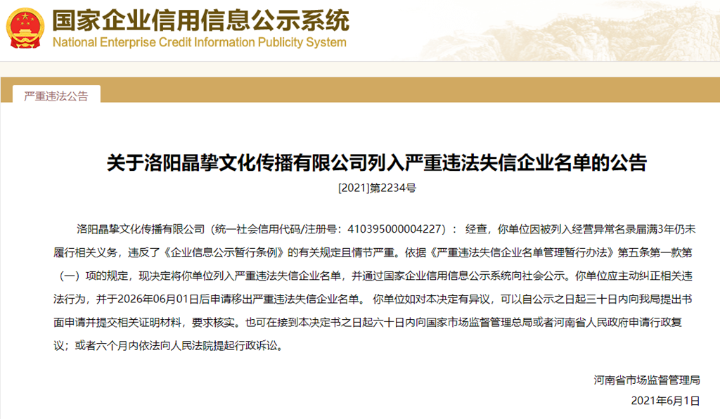 中國(guó)質(zhì)量新聞網(wǎng)訊 從國(guó)家企業(yè)信用信息公示系統(tǒng)獲悉,2021年6月1日,河南省市場(chǎng)監(jiān)督管理局發(fā)布關(guān)于洛陽(yáng)晶摯文化傳播有限公司列入嚴(yán)重違法失信企業(yè)名單的公告([2021]第2234號(hào))。