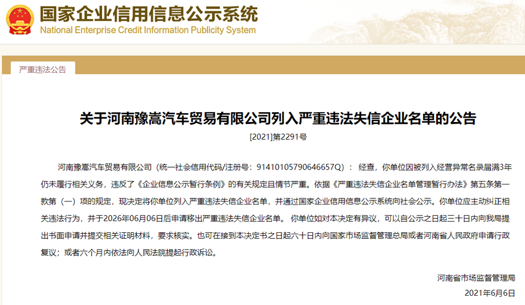 中國質量新聞網訊 從國家企業信用信息公示系統獲悉,2021年6月6日,河南省市場監督管理局發布關于河南豫嵩汽車貿易有限公司列入嚴重違法失信企業名單的公告([2021]第2291號)。