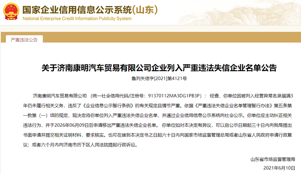 中國質(zhì)量新聞網(wǎng)訊 從國家企業(yè)信用信息公示系統(tǒng)(山東)獲悉,2021年6月10日,山東省市場監(jiān)督管理局發(fā)布關于濟南康明汽車貿(mào)易有限公司企業(yè)列入嚴重違法失信企業(yè)名單的公告(魯列失信字[2021]第4121號)。
