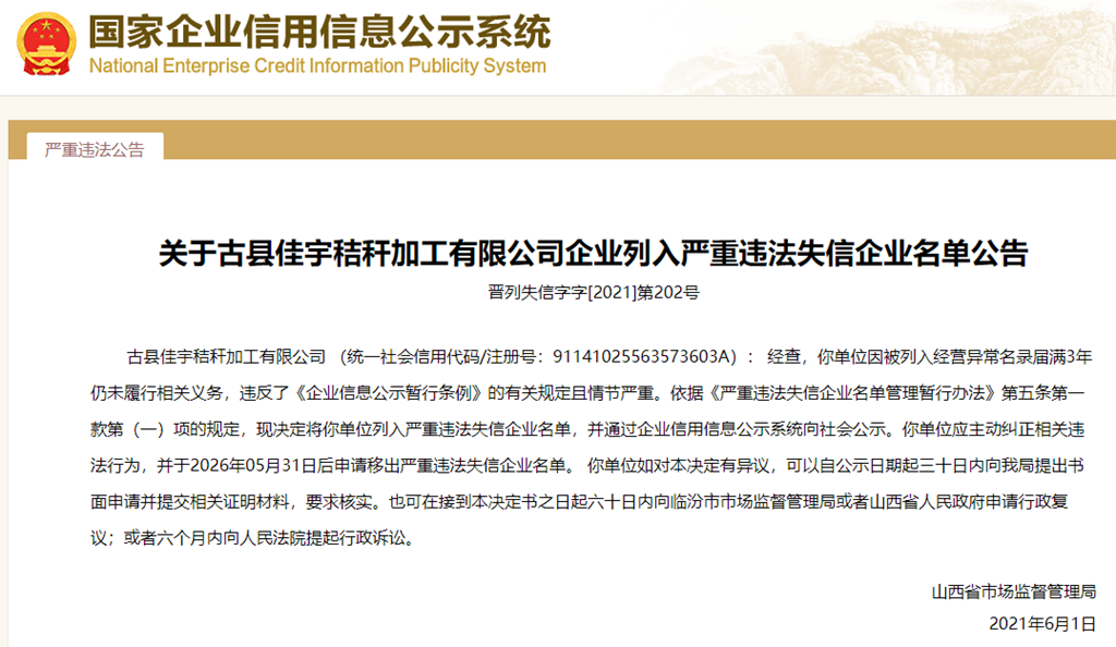 中國質量新聞網訊 從國家企業信用信息公示系統獲悉,2021年6月1日,山西省市場監督管理局發布關于古縣佳宇秸稈加工有限公司列入嚴重違法失信企業名單的公告(晉列失信字字[2021]第202號)。