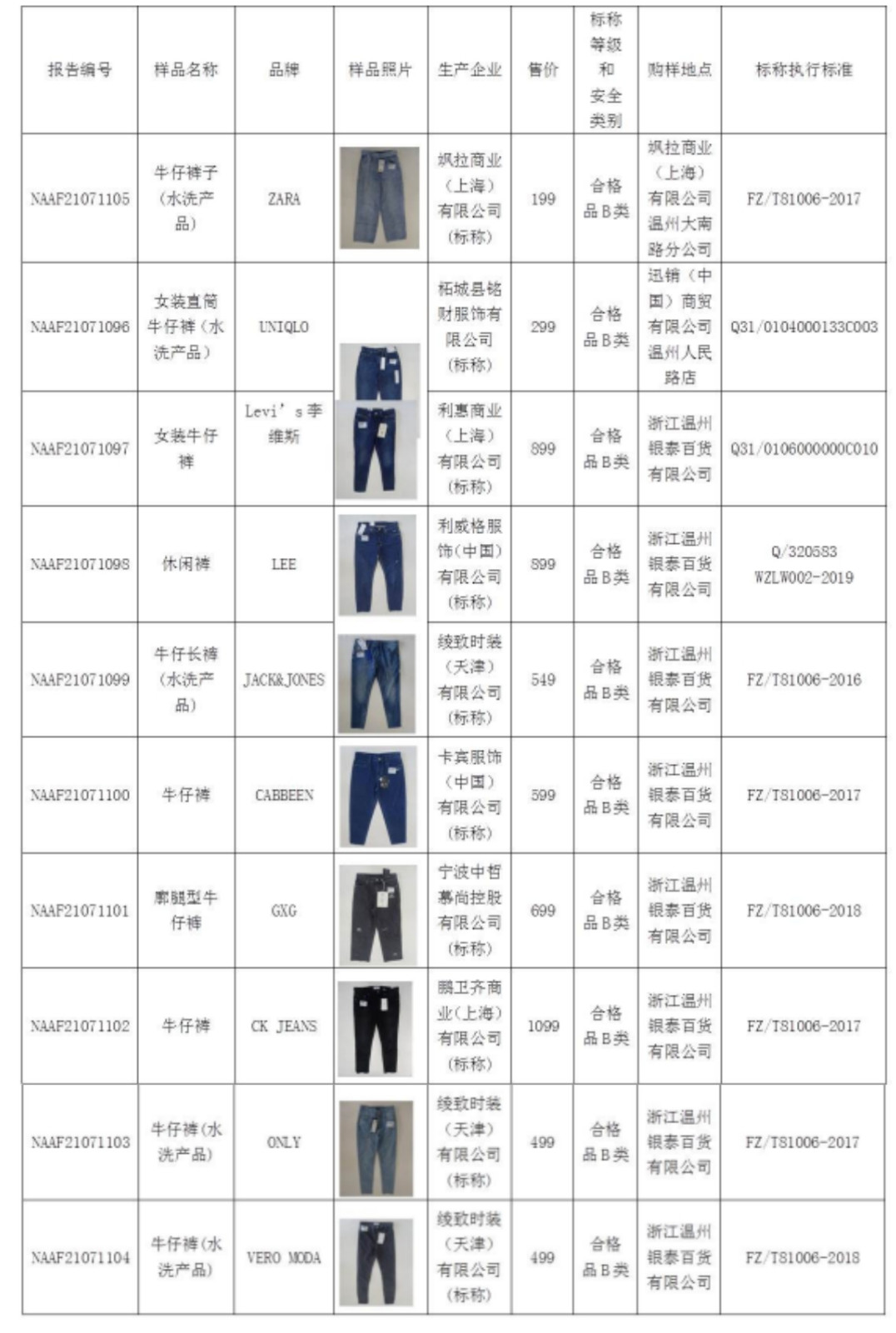 2021年牛仔褲比較試驗樣品信息表