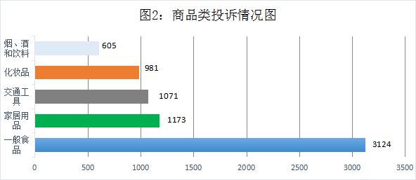 1、從商品消費類型來看,第三季度商品消費類投訴主要集中在一般食品、家居用品、交通工具、化妝品、煙酒和飲料,一般食品和家居用品的投訴量較多,分別占商品類比例的23.81%和8.94%。