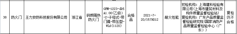 本次抽查重點對啟閉靈活性、可靠性、門扇開啟力、耐火性能、防火鎖耐火性能、防火合頁(鉸鏈)耐火性能等項目進行了檢驗。其中,上市公司“王力安防科技股份有限公司”生產(chǎn)的一款“鋼質隔熱防火門”被檢出“耐火性能”不合格,復檢仍不合格。不合格產(chǎn)品規(guī)格型號為GFM-1223-dk5 A1.00(乙級)-2-子母式-帶門鏡-帶壓型-WL6(1120),生產(chǎn)日期/批號為2021-7-20/157H012。值得一提的是,該產(chǎn)品經(jīng)過上海建科檢驗有限公司(上海市建筑材料及構件質量監(jiān)督檢驗站)和廣東產(chǎn)品質量監(jiān)督檢驗研究院〔國家消防產(chǎn)品質量監(jiān)督檢驗中心(廣東)〕復檢均不合格。