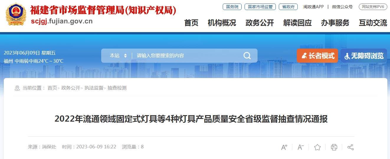 中國質(zhì)量新聞網(wǎng)訊 2023年6月9日,福建省市場監(jiān)督管理局網(wǎng)站通報2022年流通領(lǐng)域固定式燈具等4種燈具產(chǎn)品質(zhì)量安全省級監(jiān)督抽查情況。