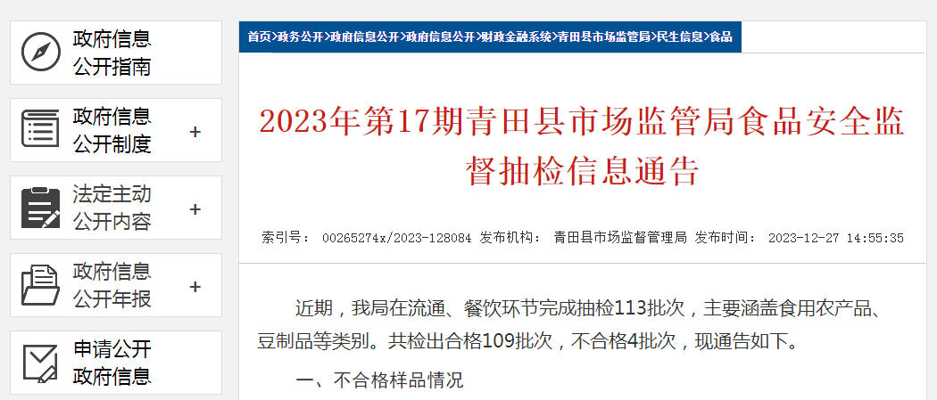 2023年第17期青田縣市場監管局食品安全監督抽檢信息通告