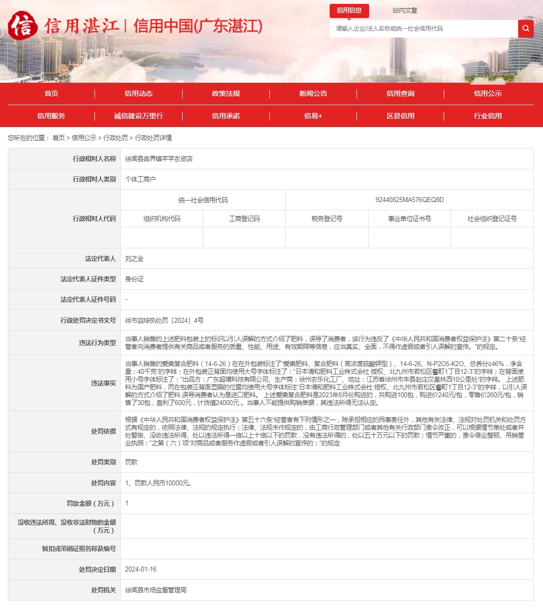 【廣東湛江】徐聞縣市場監管局對徐聞縣曲界鎮芊芊農資店作出行政處罰