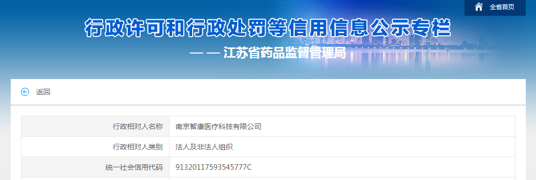 | 行政相對(duì)人名稱 | 南京智康醫(yī)療科技有限公司 |