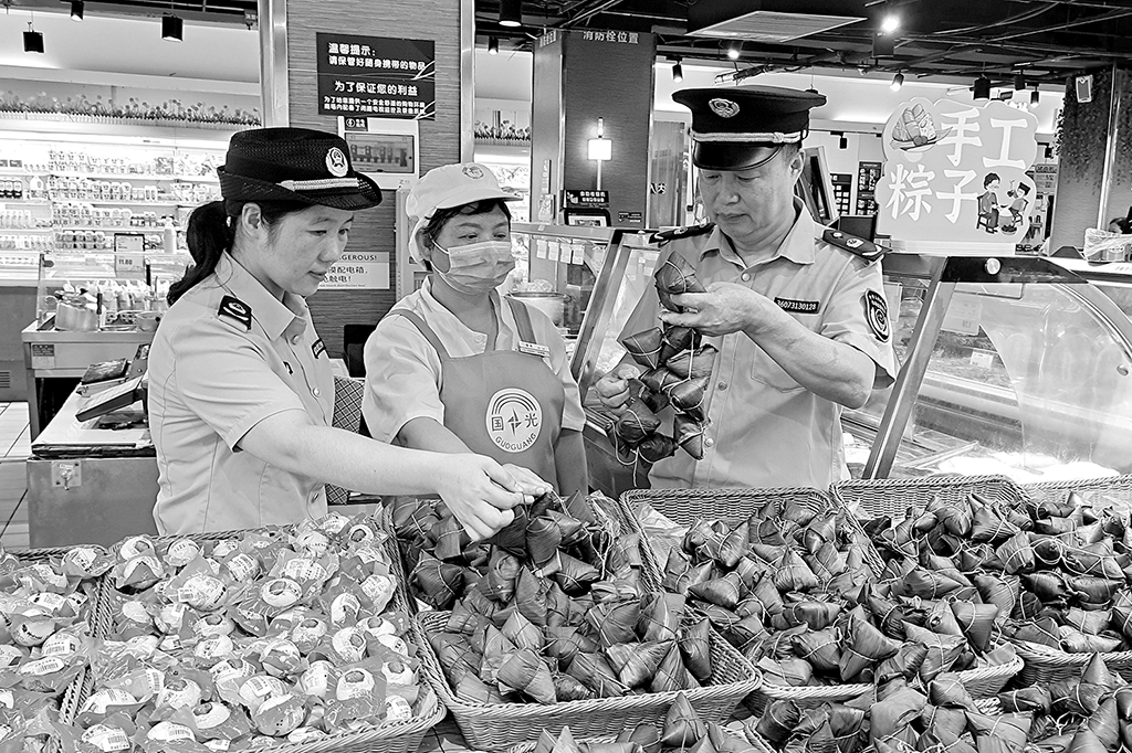 端午節前夕,江西省于都縣市場監管局以粽子、咸鴨蛋等節令食品為重點,以生產企業、大型超市、農貿市場為重點區域,緊盯生產和流通環節,組織執法人員開展食品安全執法檢查。圖為該局執法人員在一家超市檢查。王雨林 攝