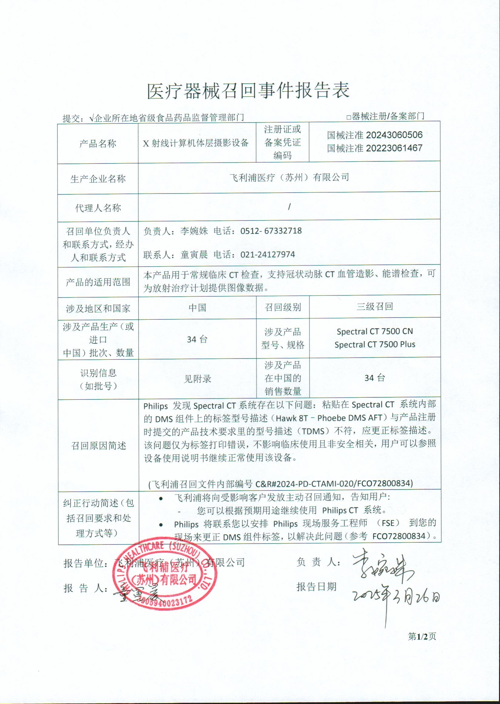 飛利浦醫療(蘇州)有限公司報告,由于粘貼在Spectrai CT系統內部的DMS組件上的標簽型號描述與產品注冊時提交的產品技術要求里型號描述不符的原因,飛利浦醫療(蘇州)有限公司對其生產的X射線計算機體層攝影設備主動召回,召回級別為三級。涉及產品的型號、規格及批次等詳細信息見《醫療器械召回事件報告表》。