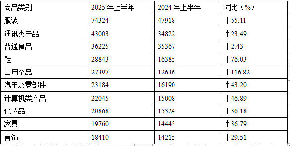 在具體商品投訴中,投訴量居前五位的分別為(如圖4所示):服裝、通訊類產品、普通食品、鞋、日用雜品。與2024年上半年相比,日用雜品、鞋、服裝投訴量上升明顯。