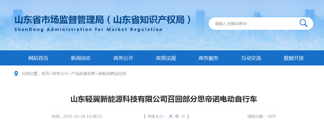 中國質量新聞網訊 據山東省市場監管局網站消息,日前,山東輕翼新能源科技有限公司按照《消費品召回管理暫行規定》的要求,向山東省市場監督管理局報告了召回計劃,將自即日起,召回2024年05月30日制造的部分思帝諾TDT071Z型號電動自行車,涉及數量為2輛。