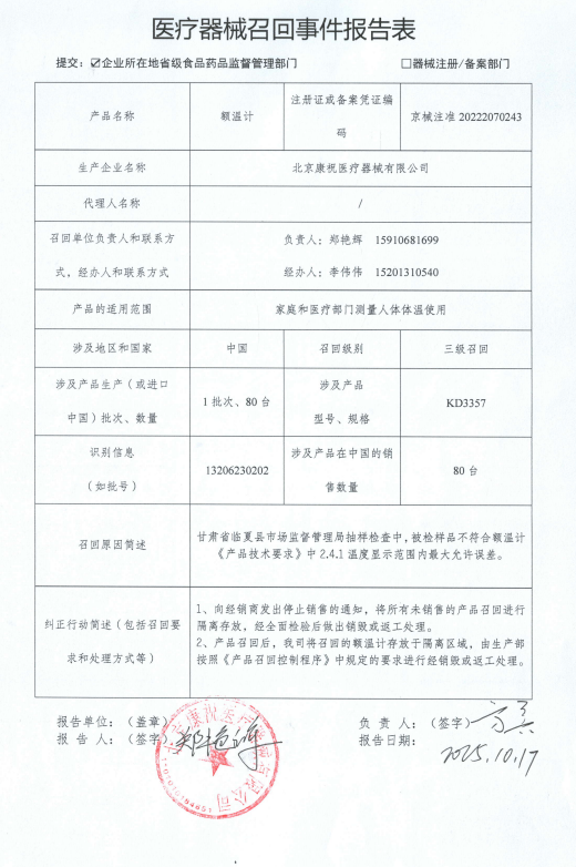由于甘肅省臨夏縣市場監督管理局抽樣檢查中,被檢樣品不符合額溫計《產品技術要求》中2.4.1溫度顯示范圍內最大允許誤差。北京康祝醫療器械有限公司對其生產的額溫計(注冊或備案號:京械注準20222070243 )主動召回。召回級別為三級。涉及產品的型號、規格及批次等詳細信息見《醫療器械召回事件報告表》。