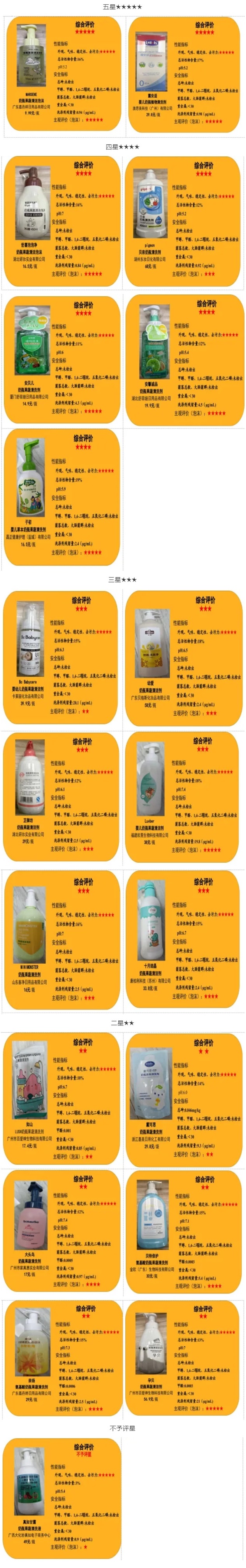 測(cè)試結(jié)果顯示,20款奶瓶清潔劑樣品中,2款樣品表現(xiàn)優(yōu)秀獲五星,5款樣品表現(xiàn)較好獲四星,6款樣品表現(xiàn)良好獲三星,6款樣品表現(xiàn)一般獲二星,1款樣品“真如甘露”不符合國(guó)家標(biāo)準(zhǔn),不予評(píng)星。測(cè)試結(jié)果僅對(duì)此次比較試驗(yàn)購(gòu)買(mǎi)的樣品負(fù)責(zé)。