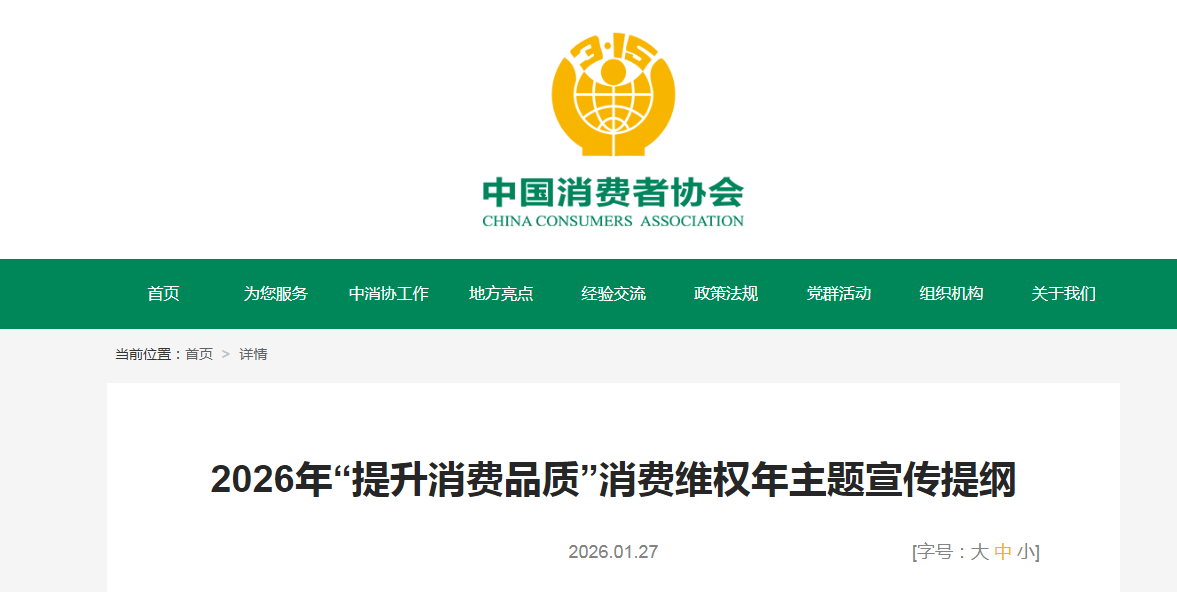 2026年是“十五五”規劃的開局之年。為全面貫徹黨的二十大和二十屆歷次全會及中央經濟工作會議精神,認真落實黨中央、國務院決策部署,強化消費者權益保護,更好滿足人民群眾日益增長的高品質生活需求,助力經濟社會高質量發展,在廣泛征集消費者和社會各界意見的基礎上,中國消費者協會確定2026年全國消協組織消費維權年主題為“提升消費品質”。