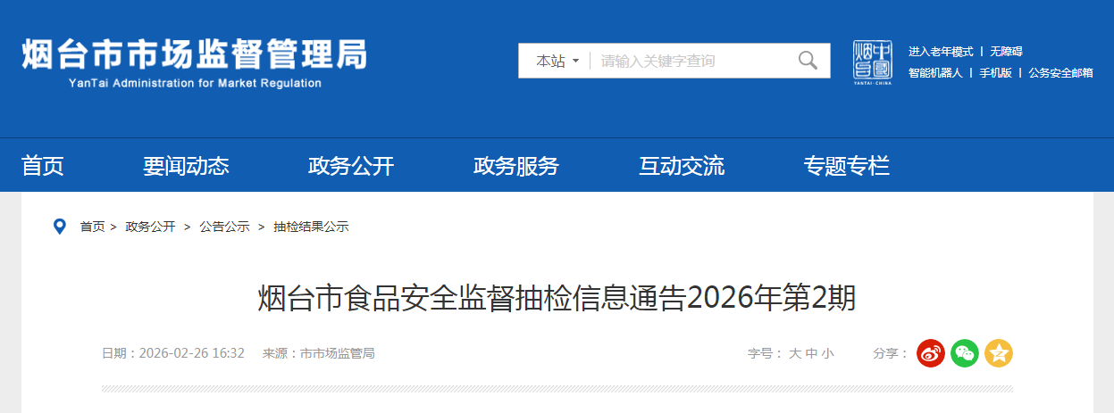 煙臺(tái)市食品安全監(jiān)督抽檢信息通告2026年第2期
