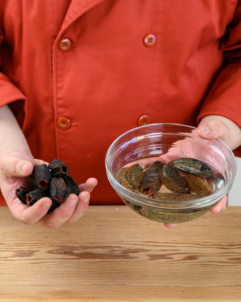 通常,紅極參都是經過脫水淡干后的干海參,但干海參并不能直接食用和烹飪,需要一個將其泡發還原的過程。這里分享一些來自加拿大(還有冰島、挪威)的紅極參(又叫北大西洋深海參,學名Cucumaria Frondosa)的做法。