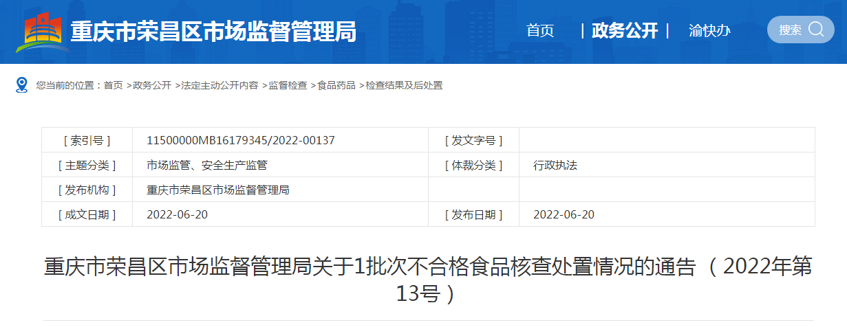 重慶市榮昌區(qū)市場監(jiān)督管理局關(guān)于1批次不合格食品核查處置情況的通告 (2022年第13號)