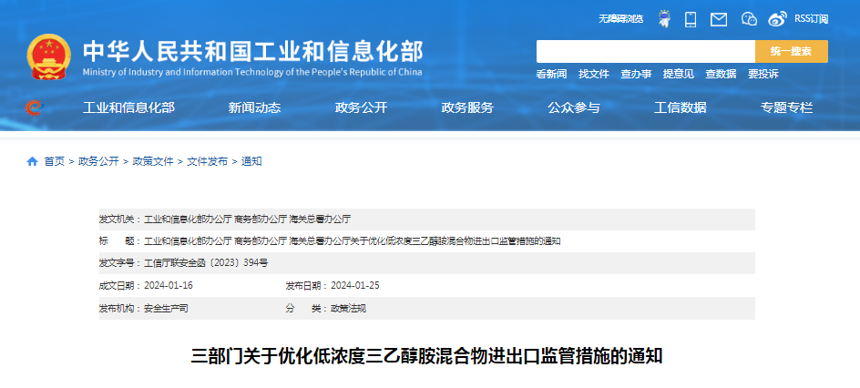 根據《中華人民共和國監控化學品管理條例》《<中華人民共和國監控化學品管理條例>實施細則》有關規定,為提升監控化學品進出口管理效能,現決定自2024年2月1日起優化部分低濃度三乙醇胺混合物進出口的監管措施?,F將有關事項通知如下: