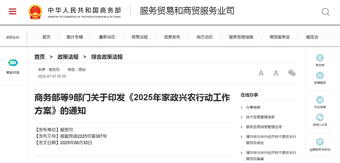 商務部等9部門關于印發《2025年家政興農行動工作方案》的通知