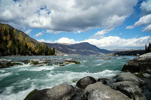 喀納斯湖口,秀美而壯闊。在雪山層林的倒映中,碧綠色的湖水,沖刷著墨玉般的巨石,奔涌而下,流入喀納斯河。