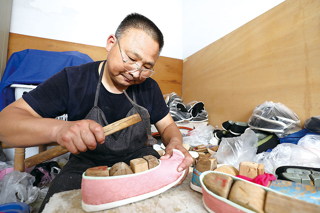 9月9日,在安徽省淮北市烈山區古饒鎮南園村李氏工藝布鞋坊,淮北市非物質文化遺產李氏布鞋傳承人李維斌正和工人一起加工制作“千層底”布鞋和仿古布鞋。熬糨糊、制袼褙、切底、包邊、捻繩、納底、做幫、绱鞋……制作一雙傳統千層底布鞋,需要30多道工序,一道道工序飽含著傳統手藝者的匠心,也展示著千層底布鞋的獨特制作技藝。20多年來,憑借著對這項傳統手藝的熱愛和情懷,李維斌始終堅守這個行業,并努力把這項技藝傳承下去,發揚光大。