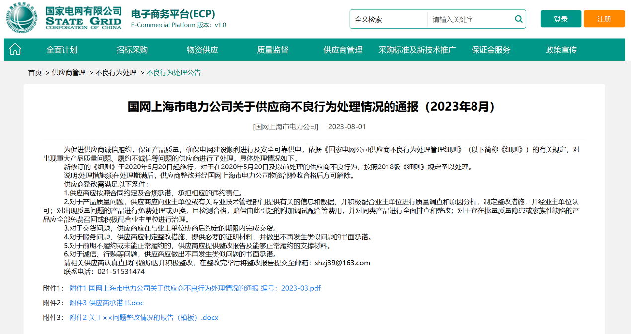 中國質量新聞網訊(明曉眢)8月1日,國家電網電子商務平臺發布《國網上海市電力有限公司關于供應商不良行為處理情況的通報(2023年8月)》。