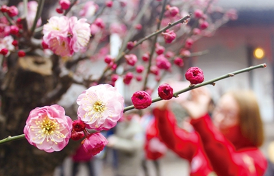 2月3日是農歷二十四節氣中的立春,江蘇蘇州古典園林獅子林綻放的紅梅給人們帶來新春的氣息,圖為游客在欣賞紅梅。