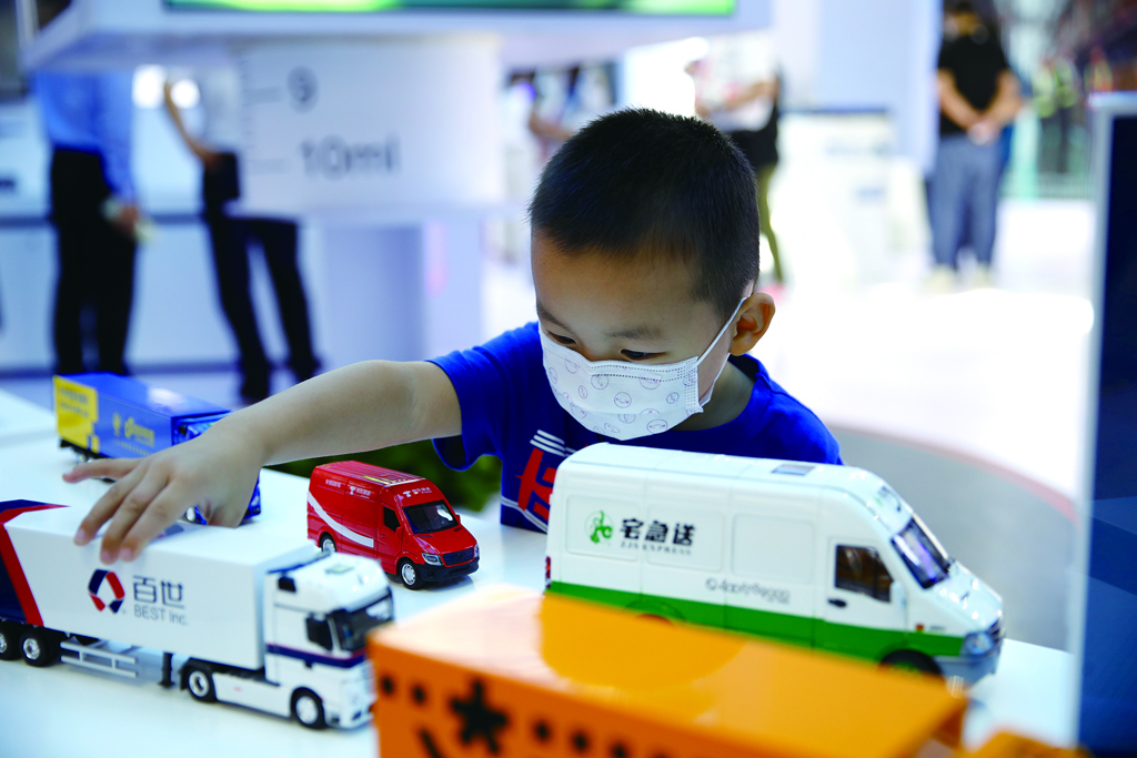 中國(guó)快遞走向世界展位前,小朋友似乎對(duì)小汽車更有興趣。