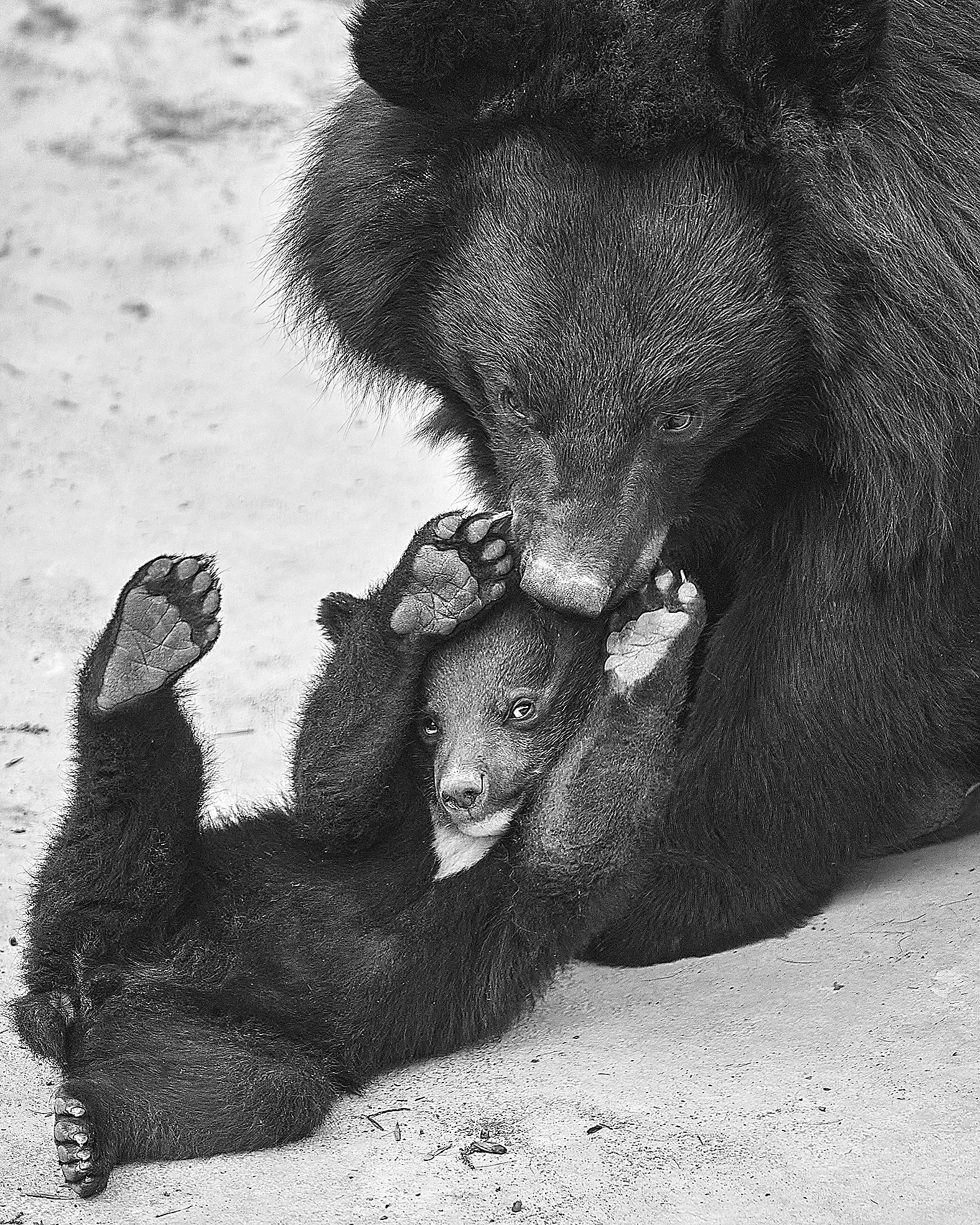 ▼亞洲黑熊布丁(雌性)和它4個(gè)月大的幼崽玩耍。它們將一起生活大約2年~3年時(shí)間。
