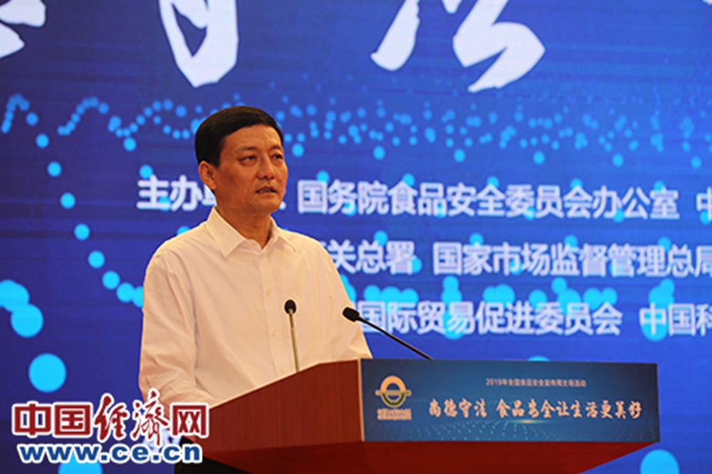 由國(guó)務(wù)院食安辦、中央文明辦、教育部等23部門(mén)聯(lián)合主辦的主題為“尚德守法 食品安全讓生活更美好”的2019年全國(guó)食品安全宣傳周6月18日正式啟動(dòng)。由經(jīng)濟(jì)日?qǐng)?bào)社承辦,中國(guó)經(jīng)濟(jì)網(wǎng)執(zhí)行承辦的宣傳周主場(chǎng)活動(dòng)在京舉行。圖為國(guó)務(wù)院食品安全辦主任、國(guó)家市場(chǎng)監(jiān)管總局局長(zhǎng)肖亞慶致辭。中國(guó)經(jīng)濟(jì)網(wǎng)記者 裴小閣/攝影