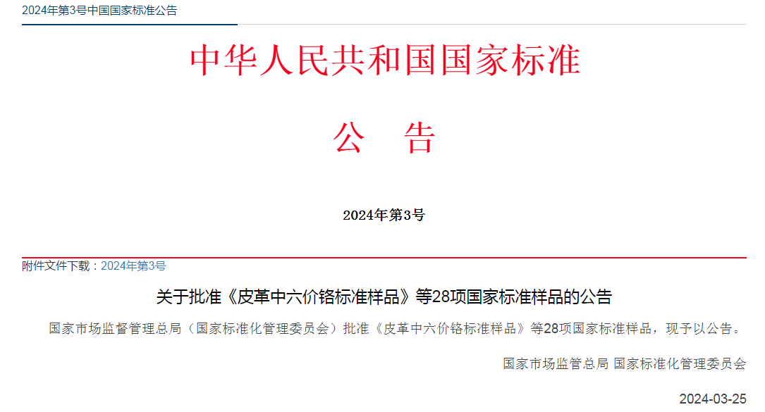 關于批準《皮革中六價鉻標準樣品》等28項國家標準樣品的公告