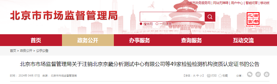 北京市市場(chǎng)監(jiān)督管理局關(guān)于注銷北京京畿分析測(cè)試中心有限公司等49家檢驗(yàn)檢測(cè)機(jī)構(gòu)資質(zhì)認(rèn)定證書的公告