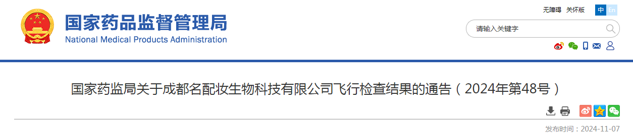 國家藥監局關于成都名配妝生物科技有限公司飛行檢查結果的通告(2024年第48號)