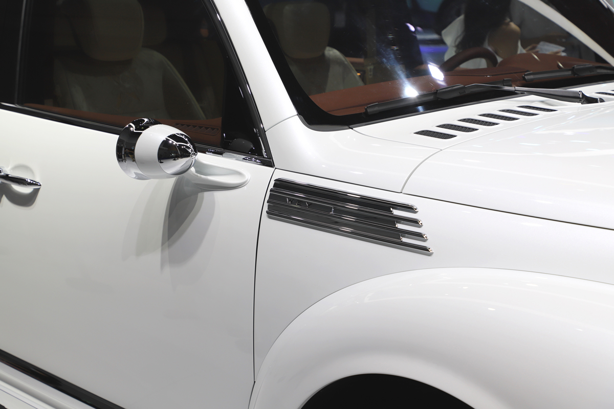外觀方面,復古潮駕在設計上使用了復古老爺車的造型設計,并采用大量的鍍鉻裝飾進行點綴。前進氣格柵內部采用了大量的橫向飾條進行裝飾,兩側的圓形大燈使用的是LED光源。