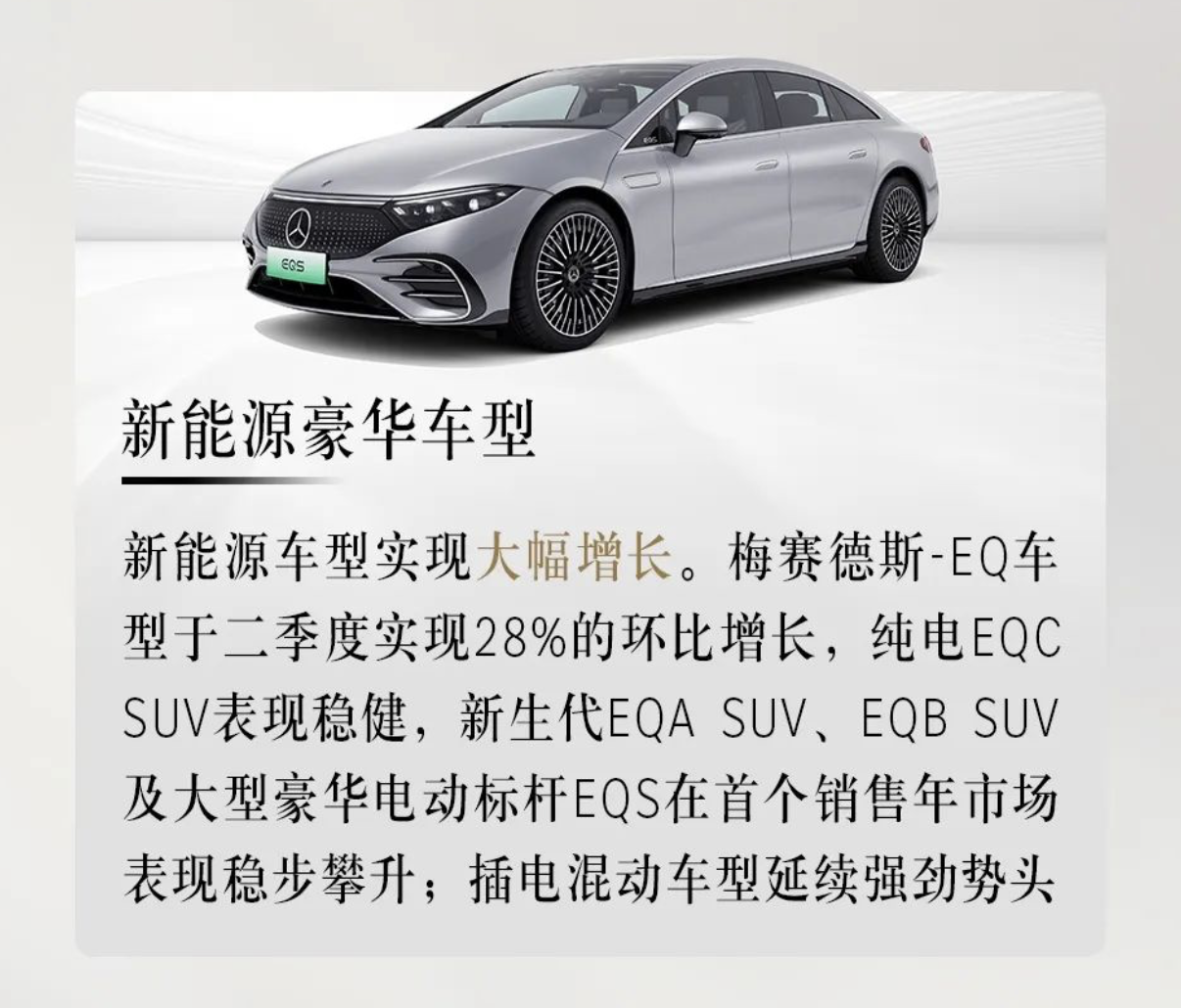 具體到車型來看,6月奔馳C級、E級、GLC等車型銷量均實現雙位數增長;上半年奔馳S級轎車銷量同比增長13%,梅賽德斯-邁巴赫同比增長62%,創下同期銷量新高。新能源豪華車型實現大幅增長,梅賽德斯-EQ車型于二季度實現28%的環比增長,純電EQC SUV 表現穩健。