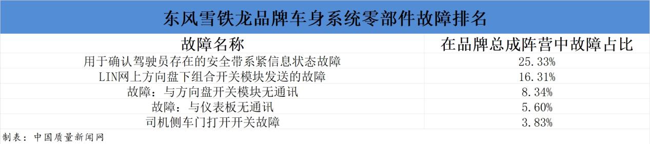 在東風雪鐵龍的車身系統總成中,排名前五的故障分別是“用于確認駕駛員存在的安全帶系緊信息狀態故障”“LIN網上方向盤下組合開關模塊發送的故障”“故障:與方向盤開關模塊無通訊”“故障:與儀表板無通訊”以及“司機側車門打開開關故障”。結合整體數據來看,該品牌的車身系統故障表現多數與開關有關。