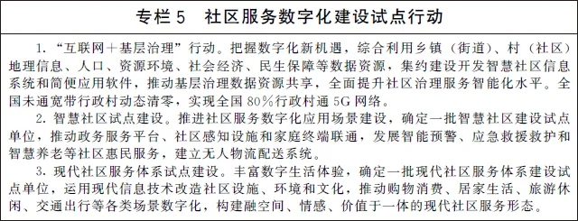 開發(fā)社區(qū)協(xié)商議事、政務(wù)服務(wù)辦理、養(yǎng)老、家政、衛(wèi)生、托育等網(wǎng)上服務(wù)項(xiàng)目應(yīng)用,推動社區(qū)物業(yè)設(shè)備設(shè)施、安防等智能化改造升級。集約建設(shè)智慧社區(qū)信息系統(tǒng),開發(fā)智慧社區(qū)移動應(yīng)用服務(wù),加速線上線下融合。推進(jìn)數(shù)字社區(qū)服務(wù)圈、智慧家庭建設(shè),促進(jìn)社區(qū)家庭聯(lián)動智慧服務(wù)生活圈發(fā)展。大力發(fā)展社區(qū)電子商務(wù),探索推動無人物流配送進(jìn)社區(qū)。推動“互聯(lián)網(wǎng)+”與社區(qū)服務(wù)的深度融合,逐步構(gòu)建服務(wù)便捷、管理精細(xì)、設(shè)施智能、環(huán)境宜居、私密安全的智慧社區(qū)。以縣(市、區(qū)、旗)為單位,支持利用互聯(lián)網(wǎng)、物聯(lián)網(wǎng)、區(qū)塊鏈等現(xiàn)代信息技術(shù),深入組織開展智慧社區(qū)、現(xiàn)代社區(qū)服務(wù)體系試點(diǎn)建設(shè),高效匹配社區(qū)全生活鏈供需,擴(kuò)大多層次便利化社會服務(wù)供給。鼓勵社會資本投資建設(shè)智慧社區(qū),運(yùn)用第五代移動通信(5G)、物聯(lián)網(wǎng)等現(xiàn)代信息技術(shù)推進(jìn)智慧社區(qū)信息基礎(chǔ)設(shè)施建設(shè)。