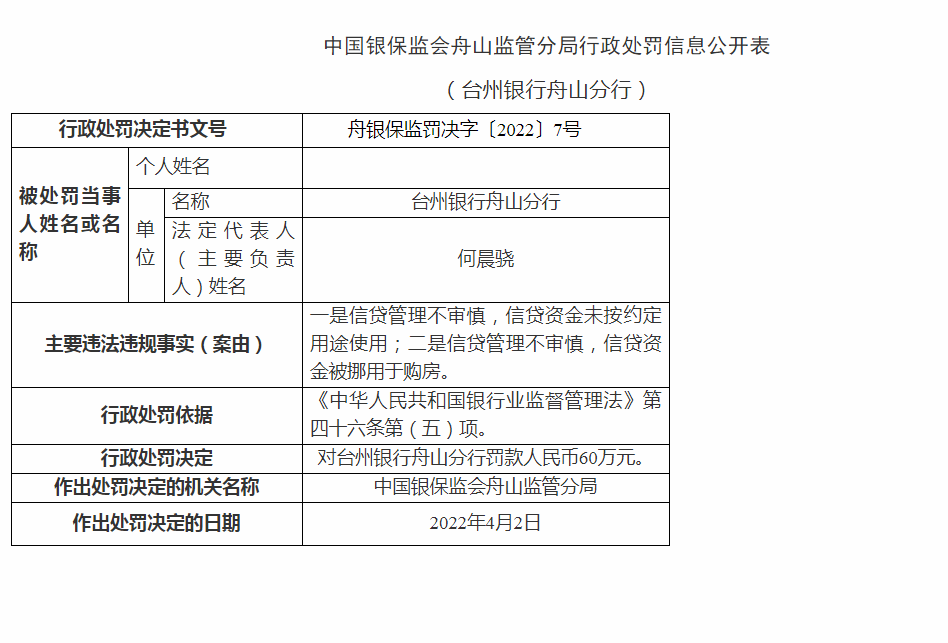 舟銀保監罰決字〔2022〕7號顯示,臺州銀行舟山分行主要違法違規事實:信貸管理不審慎,信貸資金未按約定用途使用;信貸管理不審慎,信貸資金被挪用于購房。中國銀保監會舟山監管分局依據《中華人民共和國銀行業監督管理法》第四十六條第(五)項對該分行罰款60萬元。