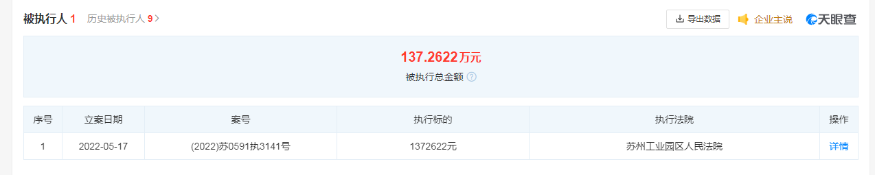 從2019年至2022年4月,該公司還有9條被執行人信息,累計執行標的約為1.58億元。執行法院分別為蘇州工業園區人民法院、蘇州市中級人民法院。該公司在2021年還有兩次被法院采取限制消費措施,關聯限制消費對象分別為王夫也和王忠軍。