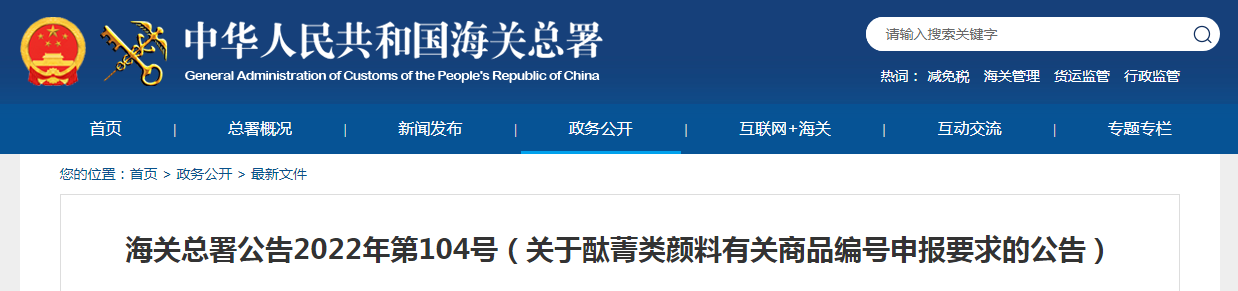 海關總署公告2022年第104號(關于酞菁類顏料有關商品編號申報要求的公告)